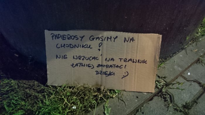 Pomyślałem o tym, gdy przeczytałem na przystanku pod blokiem ten piękny komunikat zostawiony przez kogoś, kto sprząta chodnik i przystanek. Nie prosi, by nie śmiecić. Prosi, by śmiecić tak, by ułatwić mu pracę. Też mnie to urzekło.